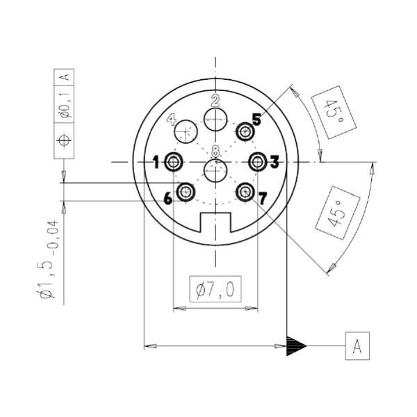 According AISG specification C485 V1.1, female pin layout is based on DIN EN 61076-2-106:2012-04 variant 08-a, pins 2, 4 and 8 are not in use for AISG applications, but it must be ensured that fully loaded male connectors according DIN EN 61076-2-106:2012-04 variant 08-a are pluggable; pin 1 shall not be used for new constructions, only needed to keep compatibility to older versions.